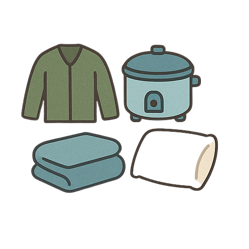乾淨衣物、乾淨鞋子、女性用品 (衛生棉、乾淨內衣褲)