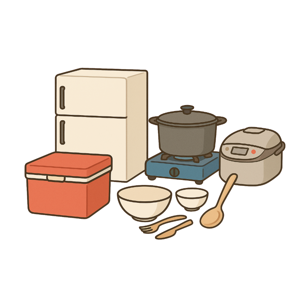 餐具、棉被、枕頭、行軍床、床墊、睡袋